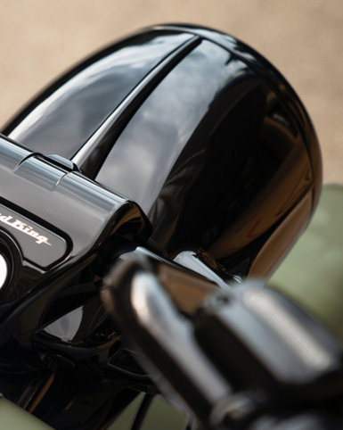 Der 11 Zoll tiefer gelegte Motorschutz ist weiter nach vorn gerichtet, um viel Platz für Bremse, Schaltwippe und die Beine zu bieten. Zusammen mit der Mittelkonsole mit niedrigerem Profil betont er die gestreckte Silhouette der Road Kind Special.