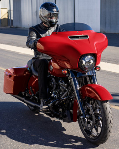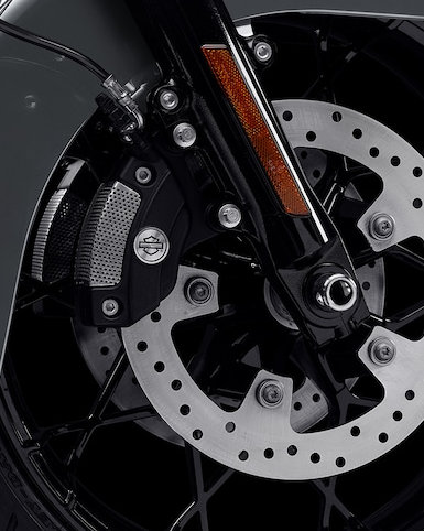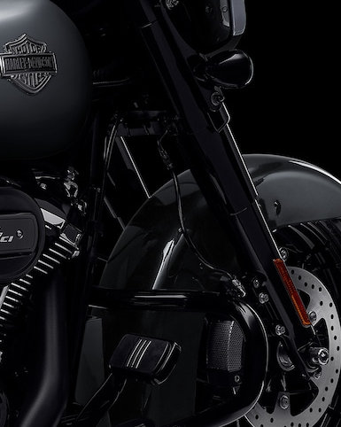 Der 11 Zoll tiefer gelegte Motorschutz ist weiter nach vorn gerichtet, um viel Platz für Bremse, Schaltwippe und die Beine zu bieten. Zusammen mit der Mittelkonsole mit niedrigerem Profil betont er die gestreckte Silhouette der Street Glide Special.