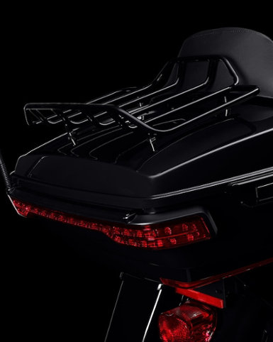Ein eleganter und dennoch geräumiger Tour-Pak-Gepäckträger, der mit Leichtigkeit die Helme für Fahrer und Sozius sowie einige zusätzliche Reiseutensilien aufnimmt.