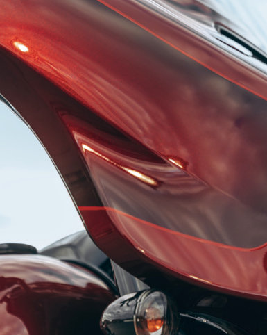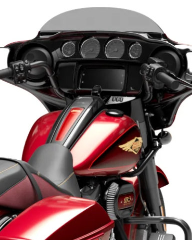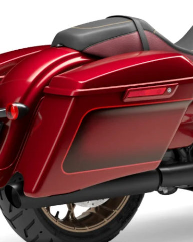 Den Basislack bildet klassisches, glänzendes Heirloom Red. Es wird von dunklerem, in einem Schattierungseffekt gehaltenen Midnight Crimson ergänzt und mit hellroten Pinstripes verziert. Das Tanklogo präsentiert einen Adler im Art-Déco-Stil. Die Sitze sind mit einem gestickten goldfarbenen Harley-Davidson Logo versehen und an den Flanken wie die Koffer rot gefärbt. Den Antriebsstrang zieren Inserts in der Farbe Red Fade.
