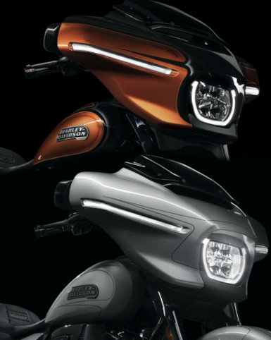 Die neu gestaltete Batwing-Verkleidung, die nur bei der CVO Street Glide zum Einsatz kommt, behält ihren Look in der Grundform eines T bei, doch die Silhouette wurde aktualisiert, um ein dynamischeres Gesamtbild zu erzeugen. Die Splitstream-Belüftung ist nun vollständig in das Design integriert und die Verkleidung erstreckt sich auch unter den Scheinwerfer. Ein unverwechselbares Designelement bilden die Signature LED Lichtquellen, die nicht nur nachts für einen hohen Wiedererkennungswert der Maschine bürgen. Um den cleanen Look der Verkleidung zu schärfen, wurden die bernsteinfarbenen LED-Blinker in die linken und rechten Lichtstreifen integriert, sodass keine separaten Fahrtrichtungsanzeiger erforderlich sind.