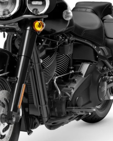 Das düstere, schwarze Finish betont die Kraft des Milwaukee-Eight. Details:Antriebsstrang mit oberen Kipphebel-, Nockenwellen-, Getriebe- und Primär-Abdeckung in Wrinkle Black. Kontrastierend die unteren Kipphebel­abdeckungen in glänzend Schwarz. Schwarze Lichtbalken, Windschutz­scheiben­halterungen, Abstandshalter für Blinker, Spiegel, Gabelbrücken und Radnaben. Mattschwarze Auspuffblenden.