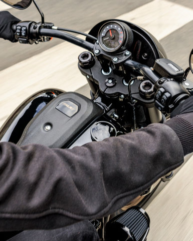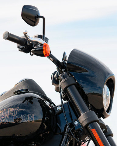 Die unauffällige, texturierte schwarze Tankkonsole mit FXLRS-Badge deckt die Schweißnähte des Tanks ab und ersetzt die Konsole mit Instrumenten, wie sie an der Low Rider S 114 verwendet wird. Die Position des Lenkers platziert das Messgerät näher an die Sichtlinie.<