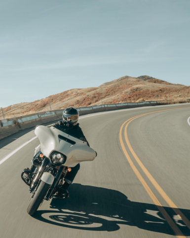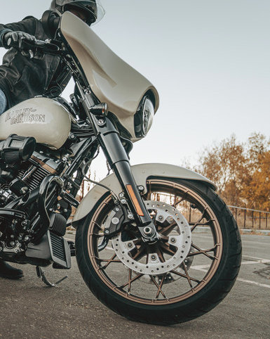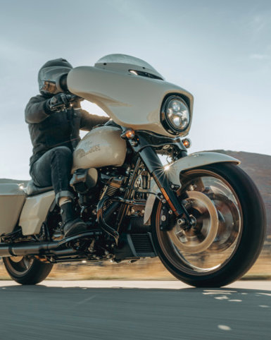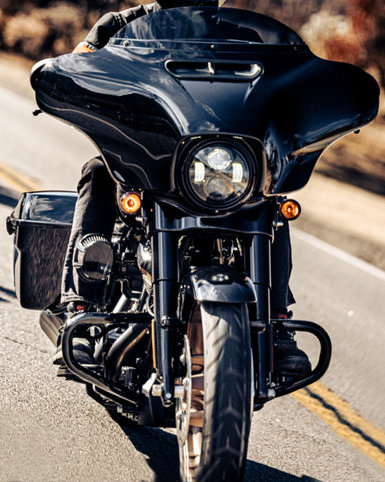 Unverwechselbares H-D Design dank der lenkerfesten Verkleidung mit Splitstream-Luftkanal zur Reduzierung von Turbulenzen am Kopf und mit niedrigem getönten Windschild.