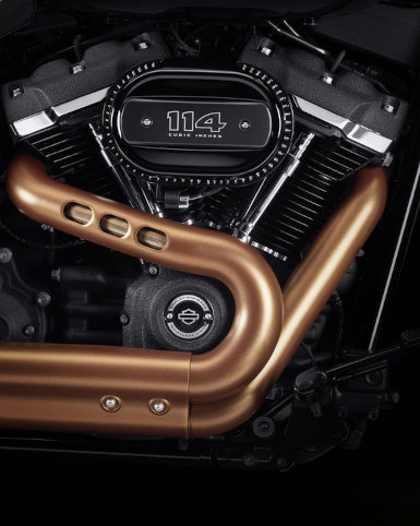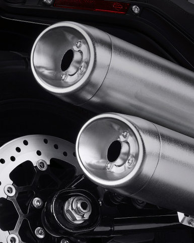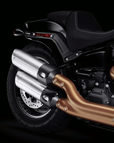 Die 2-1-2-Auspuffanlage mit hochgezogenen Schalldämpfern in Custom-Kontrast sorgt für fein abgestimmte Leistung. Und nicht zuletzt für das sonore Harley-Grollen. Das Design der Anlage verleiht der Fat Bob das gewisse Quentchen mehr zu ihrer sowieso schon agrressiven Optik.