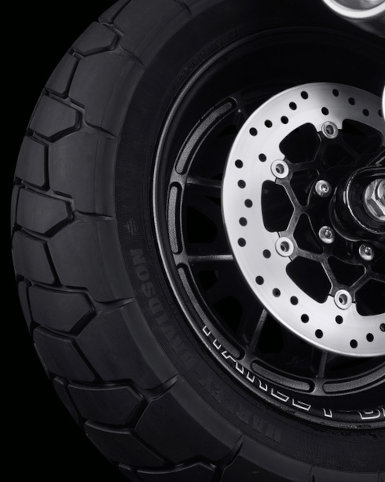 Auffällige Aluminiumräder mit breiten, aggressiven Reifen passen haarscharf zur Optik der Fat Bob. Hinten sorgt ein 180-mm breiter Reifen und vorne der 150-mm-Vorderreifen für Top-Haftung auf dem Asphalt.