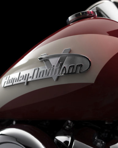 Die verchromten Tankbadges tragen den Schriftzug Harley-Davidson V, deren Stil von den Tankplaketten der Jahre 1955 und 1956 inspiriert ist.