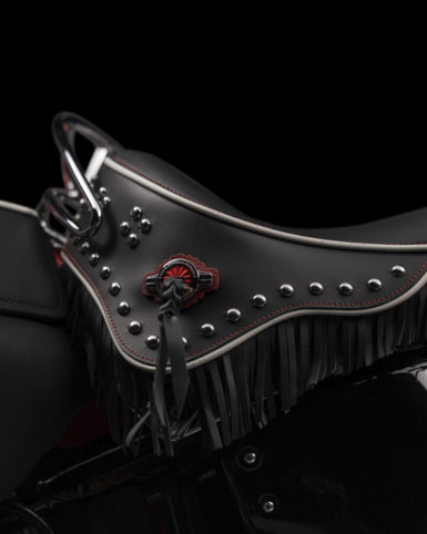 Der Solosattel ist mit einem ledernen Volant ausgestattet, der von Fransen, Chromnieten, weißen Paspeln mit roten Kontrastnähten, verchromten Conchos mit einer Umrandung und einem Zentrum aus rotem Acryl geziert und von einer verchromten Reling überspannt wird. Im gleichen Stil ist das lederne Tankstrap gehalten.