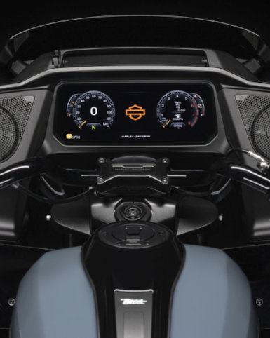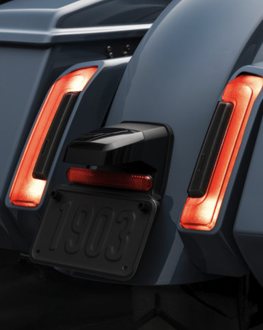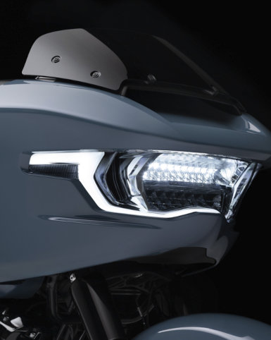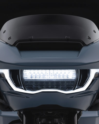 Die Sharknose-Verkleidung tritt in ihr nächstes Entwicklungsstadium ein - mit einem neuen Design, vollständig integrierter LED-Beleuchtung und einer neuen Verkleidungsscheibe. Die Verkleidung der Road Glide wurde mit Hilfe computergestützter numerischer Strömungsmechanik weiterentwickelt, um ihre Aerodynamik zu verbessern. Mit einer neuen Interpretation der originalen rahmenfesten Verkleidung optimiert sie den Einsatz auf der Straße genauso wie den Komfort für den Fahrer.