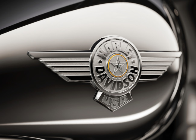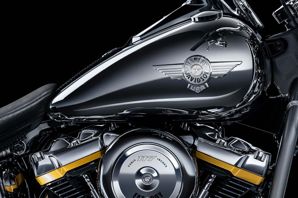 Das originale und kultige Tankemblem der Fat Boy mit flachen, geraden Flügeln im gebürsteten silbernen Finish ist zurück.