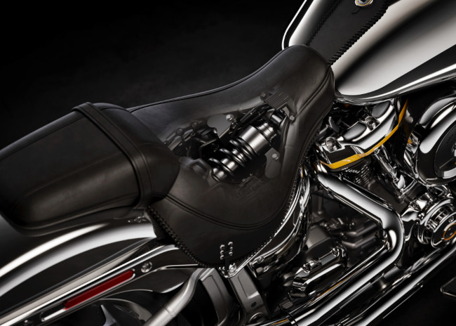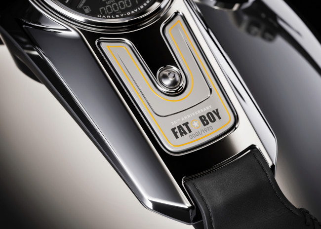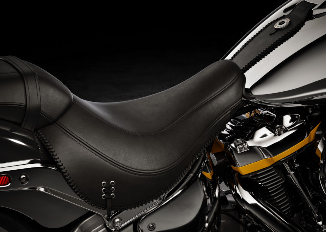 Der zweiteilige Sitzbezug und der Leder-Tankriemen der Fat Boy zählen zu den auffälligen, aber zugleich ebenso nostalgischen wie ikonischen Details, die als Hommage an das ursprüngliche Design gewählt wurden.