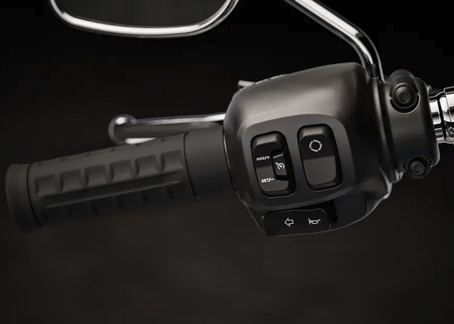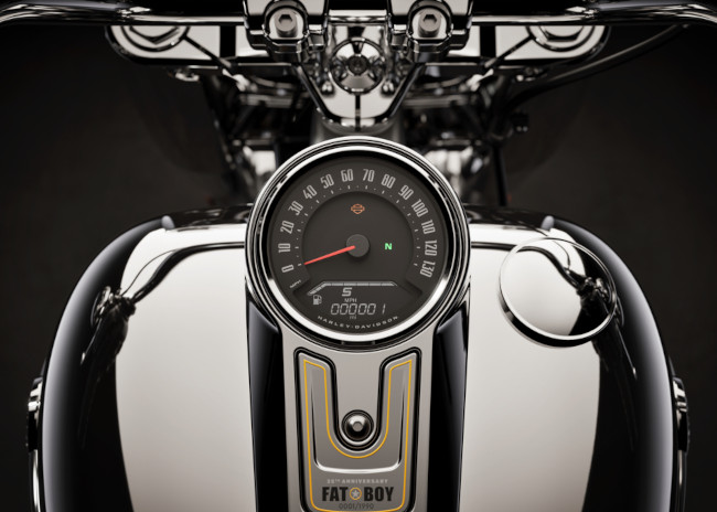 Das fünf Zoll große analoge Instrument auf dem Tank ist eine Anspielung auf die ursprüngliche Fat Boy®, umfasst jetzt aber auch ein digitales Display, das wichtige Fahrdaten wie den eingelegten Gang und den gewählten Fahrmodus (Straße, Regen oder Sport) anzeigt, damit Du Deine Fahrt optimal feinabstimmen kannst.