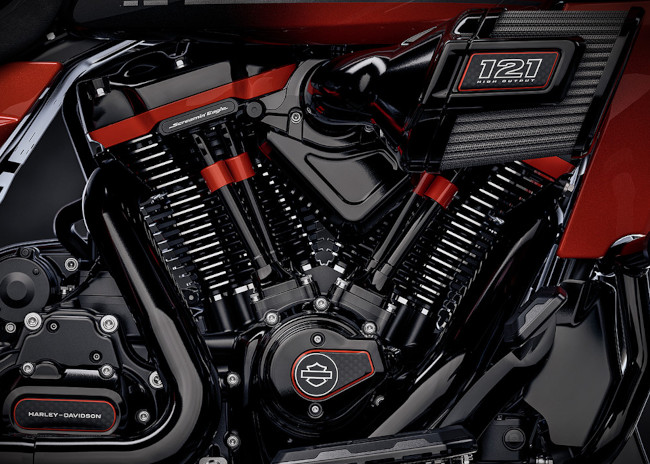 Der Milwaukee-Eight 121 High Output Motor ist weniger ein kultiviertes Triebwerk als ein rauhes, kompromissloses Power Pack. Anstelle einer variablen Ventilsteuerung hat der Motor Nockenwellen mit festen, auf Höchstleistung abgestimmten Steuerzeiten. Das Triebwerk dreht entsprechend schneller und weiter hoch und ist im mittleren Drehzahlbereich effektiver. Das Ergebnis: 94 kW bei 5020 U/min, ein maximales Drehmoment von 193 Nm und die präziseste Gasannahme, die Du je erlebt hast.