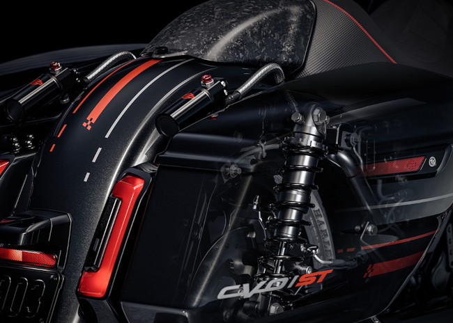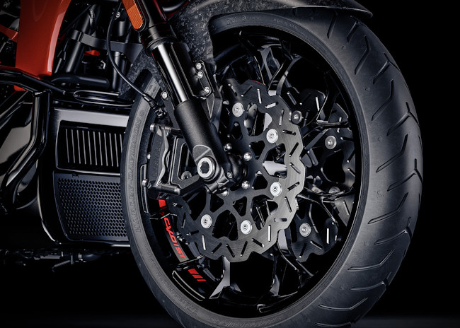 Zwei schwimmend gelagerte Hochleistungs-Bremsscheiben bieten optimale und fadingfreie Bremsleistung auch bei extremer Belastung. Im Zusammenwirken mit dem niedrigen Gewicht der Räder perfektionieren sie die Beschleunigung, die Handlichkeit und die Beherrschbarkeit der CVO ST.