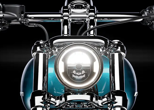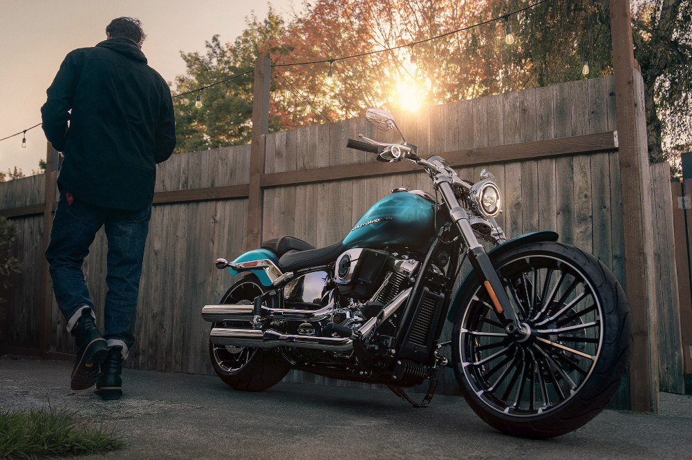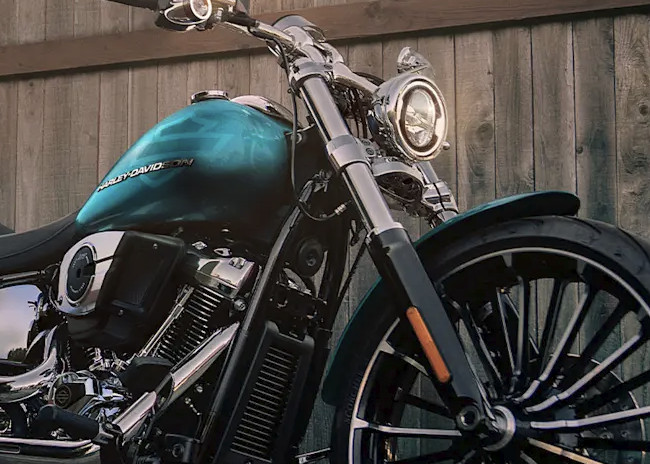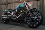 Die gereckte Telegabel ist ein prägendes Bauteil der Breakout-Silhouette und eine Hommage an die Custom-Tradition. Die Breakout ist langgestreckt und hebt sich dadurch von der Masse ab.