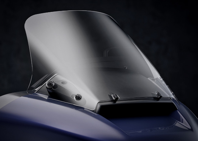 Das höhere und neu geformte Windschild leitet den Luftstrom um Fahrer und Sozius herum und sorgt so für eine angenehmere Fahrt. Dadurch spürst Du weniger Müdigkeit nach langen Tagen auf dem Bike. Das neue Profil fügt sich auf natürliche Weise in die Frontpartie der Road Glide Limited ein und bietet gerade genug Schutz vor dem Wind, um für Komfort zu sorgen, ohne dass das Motorrad sein beeindruckendes Aussehen und Fahrgefühl verliert.