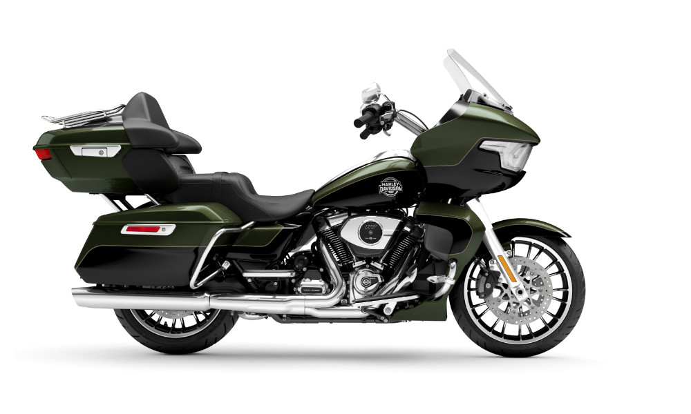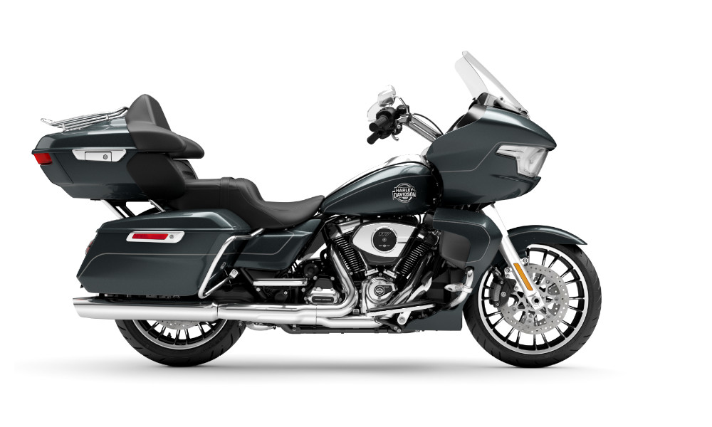 Die neuen Leichtmetallgussräder verleihen der Road Glide Limited eine kantigere, modernere Wirkung. Das Speichendesign ist dabei zweigeteilt – es beginnt an der Nabe mit 10 Speichen und endet an der Felge mit 20 Speichen. Am ganzen Motorrad finden sich Komponenten aus der Streamliner Collection, und das Bild wird abgerundet von Schutzbügeln für den Motor und die Seitenkoffer.